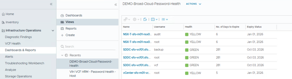 You can view the password expiry for VCF instance components under Infrastructure Operations>Configuration in the VCF Operations console