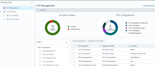 The VCF Operations console enables management of password-related tasks, such as alerts, information, and updating/remediating passwords for VCF Management components and VCF Instances.